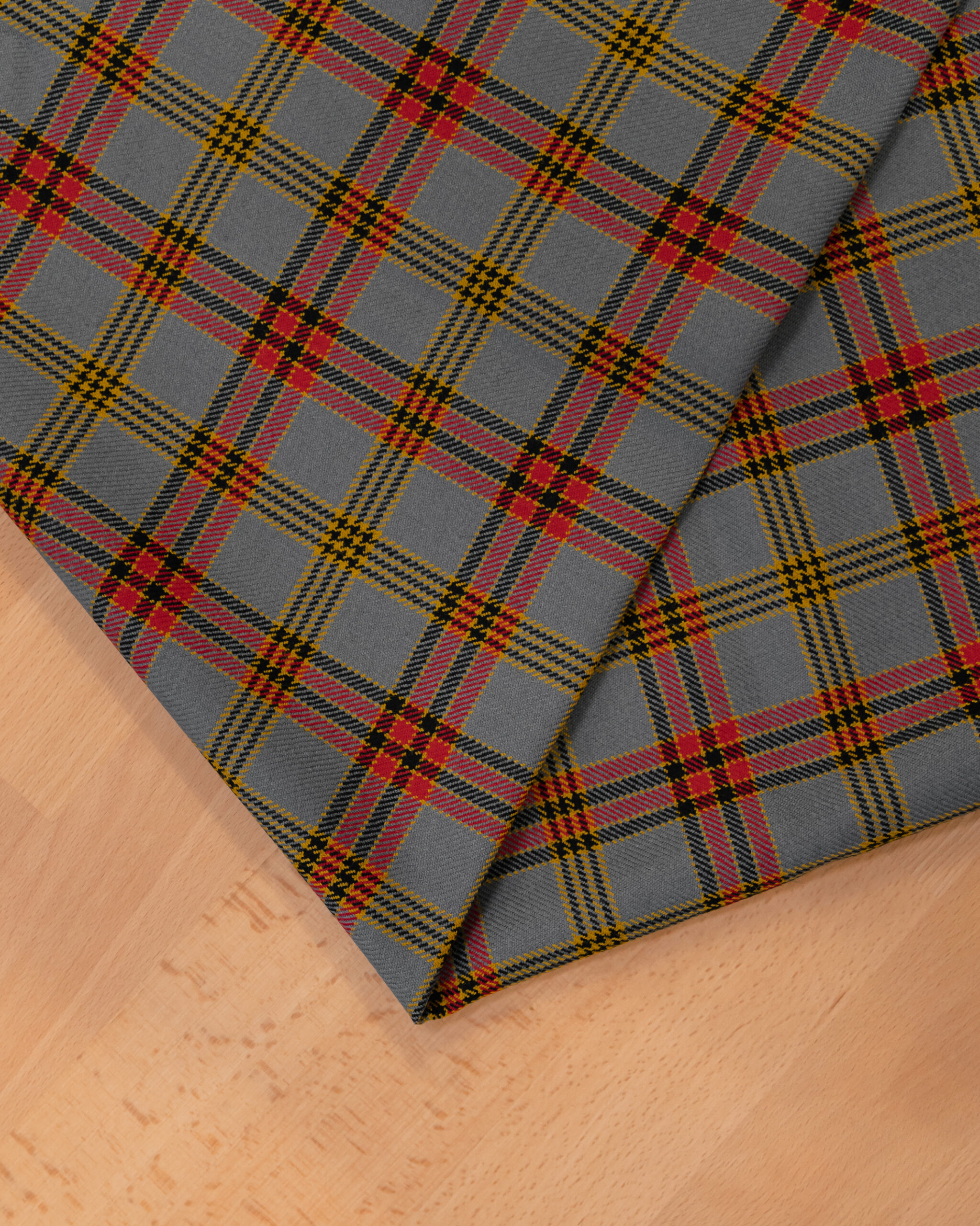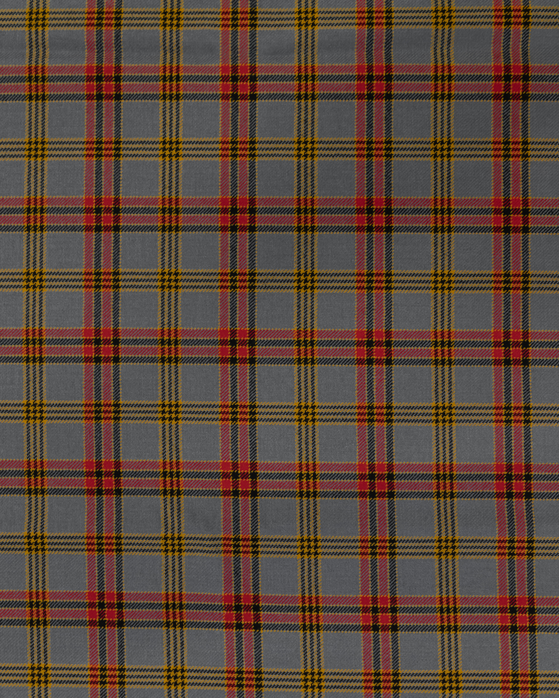 High quality wool fabric featuring a classic tartan pattern in a modern grey based colorway with red, yellow, and black accents. The design blends timeless heritage styling with a distinctive, contemporary look.